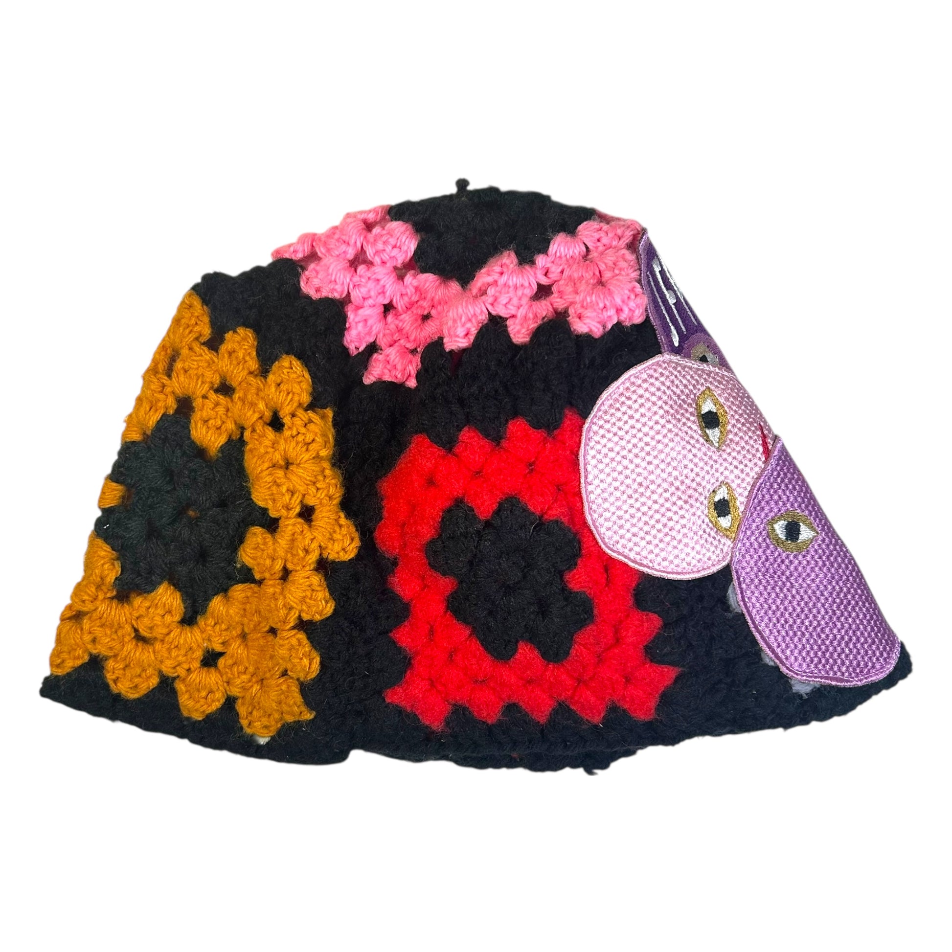 This beanie is handmade by using up cycled blanket panels that were crocheted together. The patches are custom made in house as well.