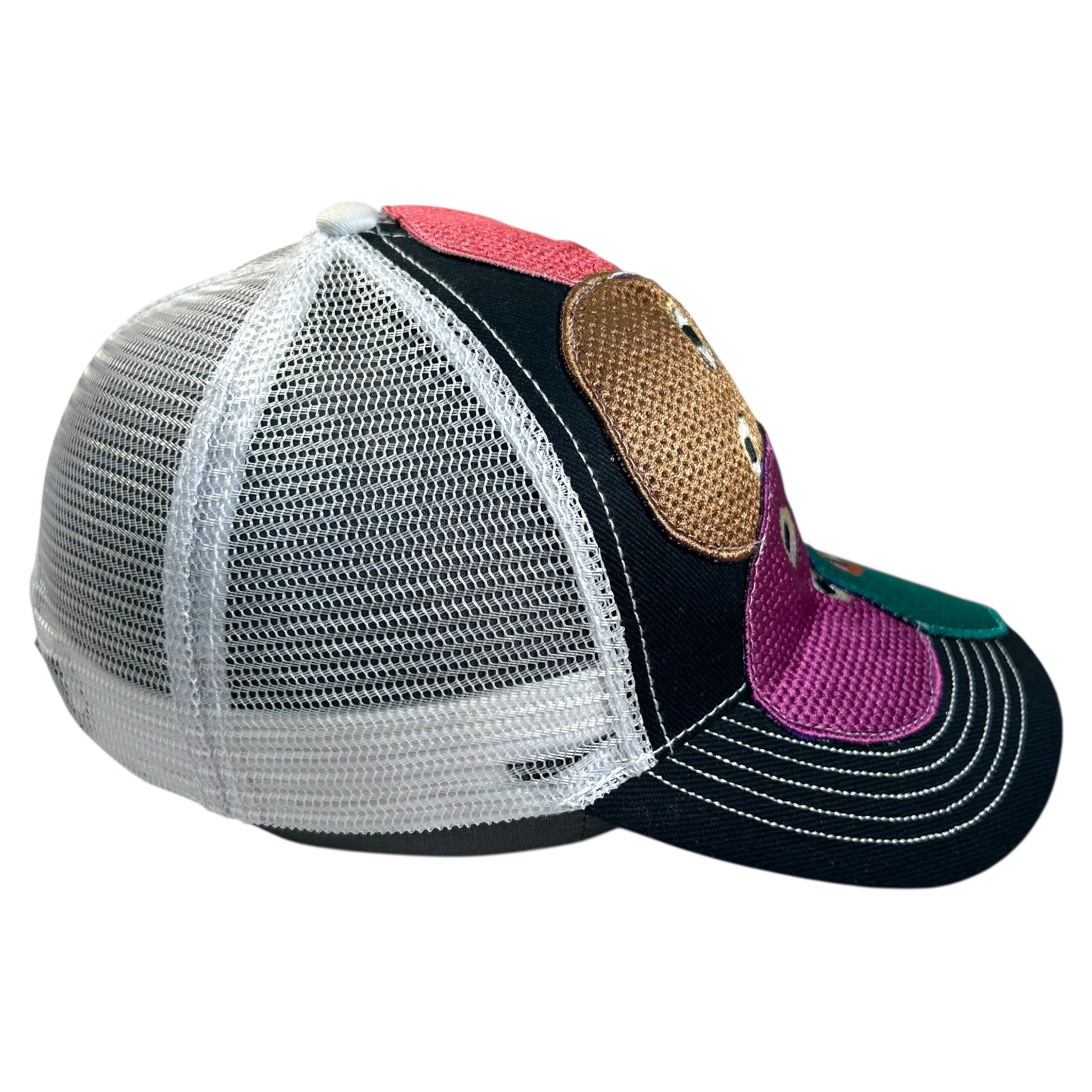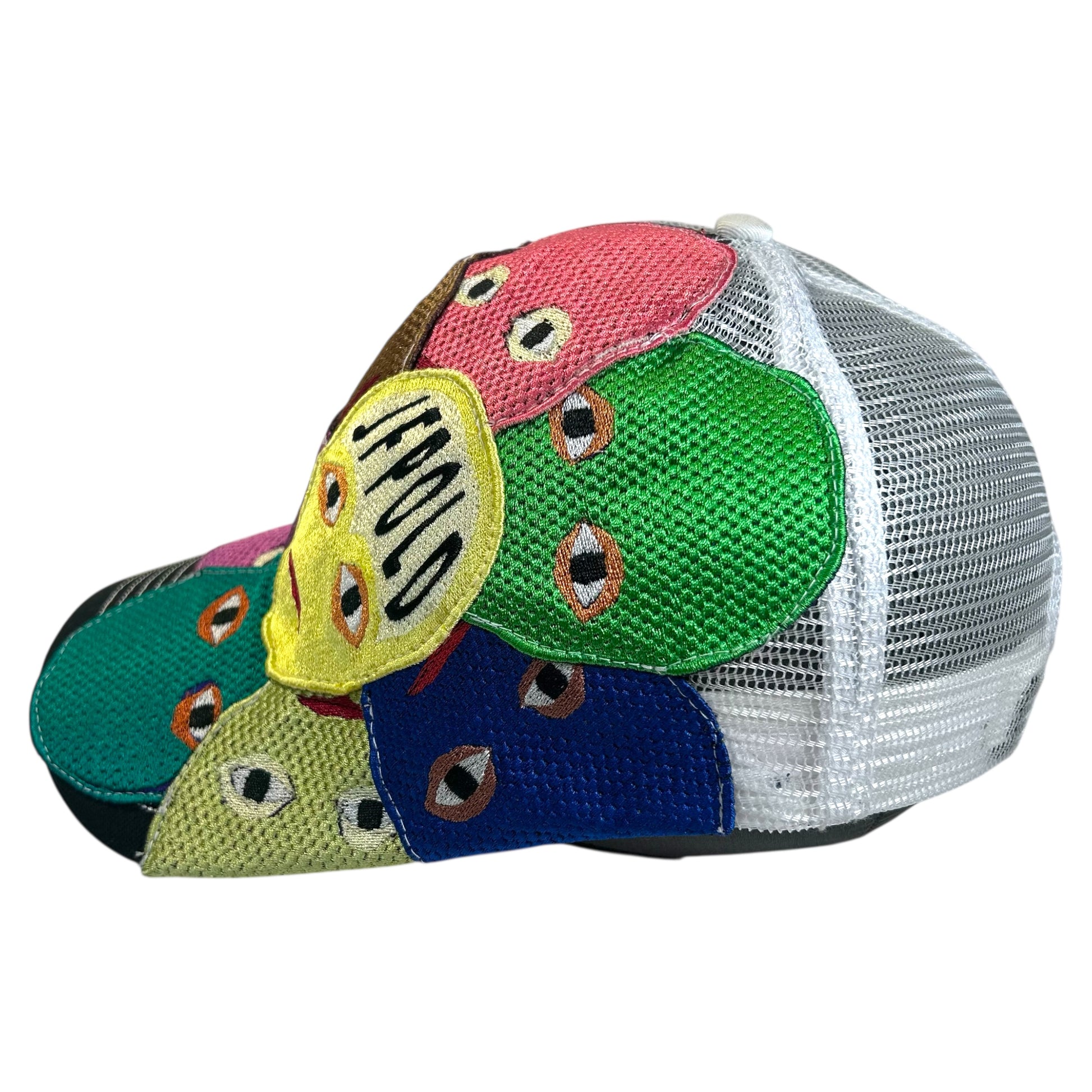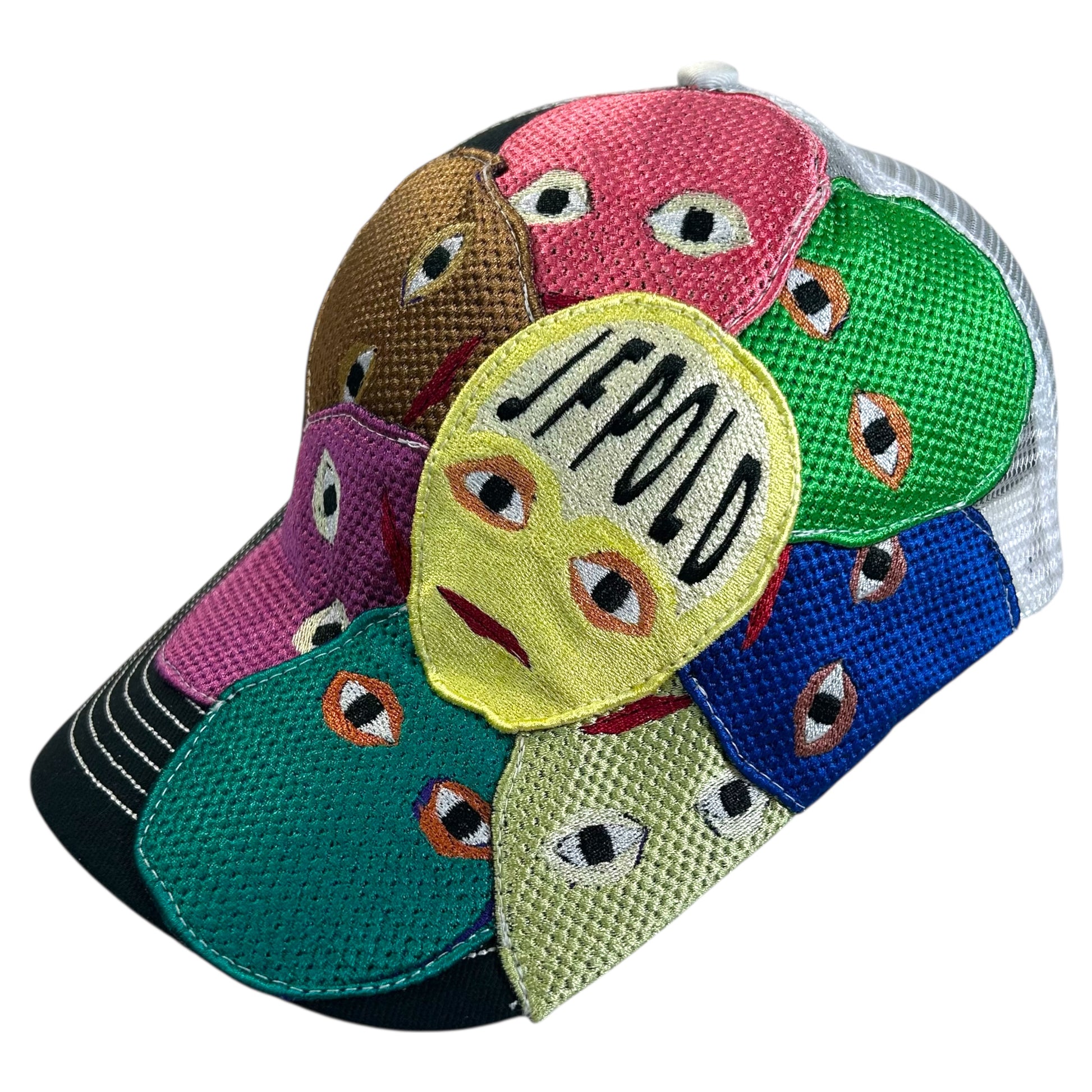 This is a vintage upcycled trucker hat that features a floral pattern of faces across the front and the brim. This hat is like an art piece on your head and it also can match with most outfits.