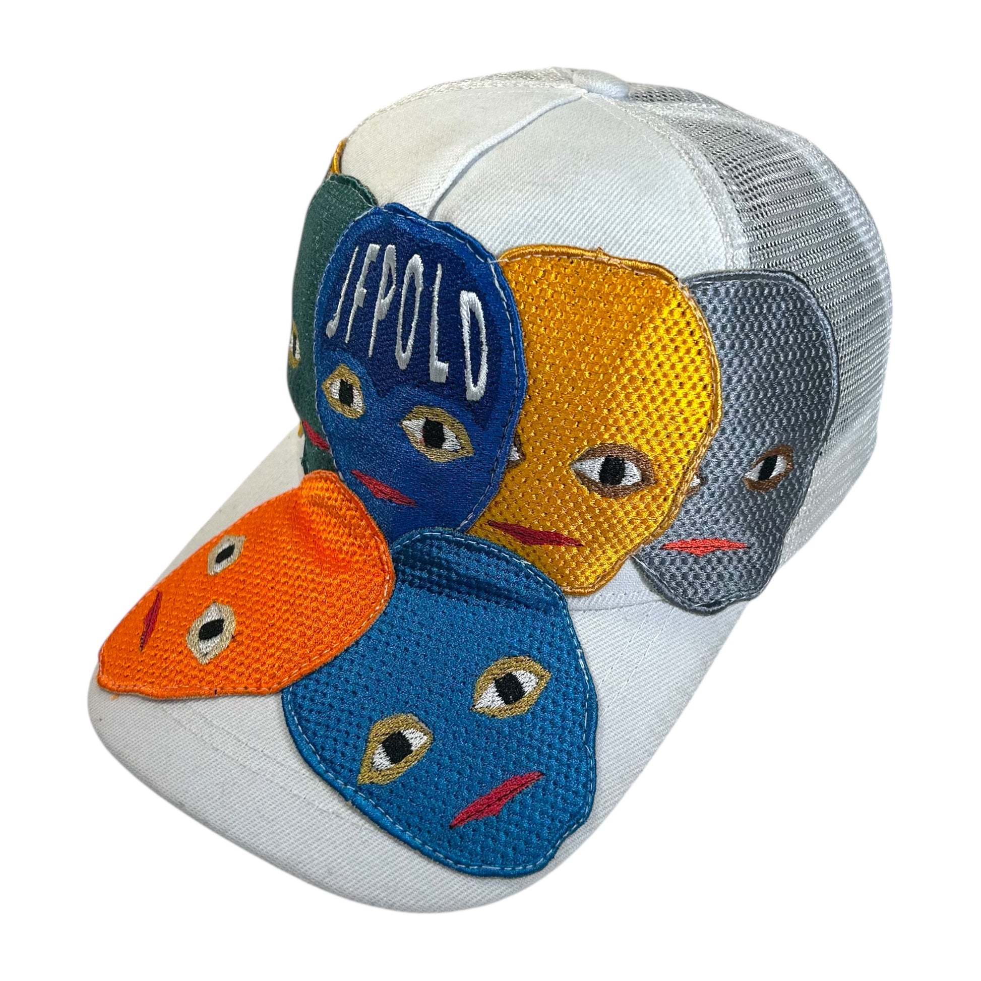 This is a vintage upcycled trucker hat that features a floral pattern of faces across the front and the brim. This hat is like an art piece on your head and it also can match with most outfits.