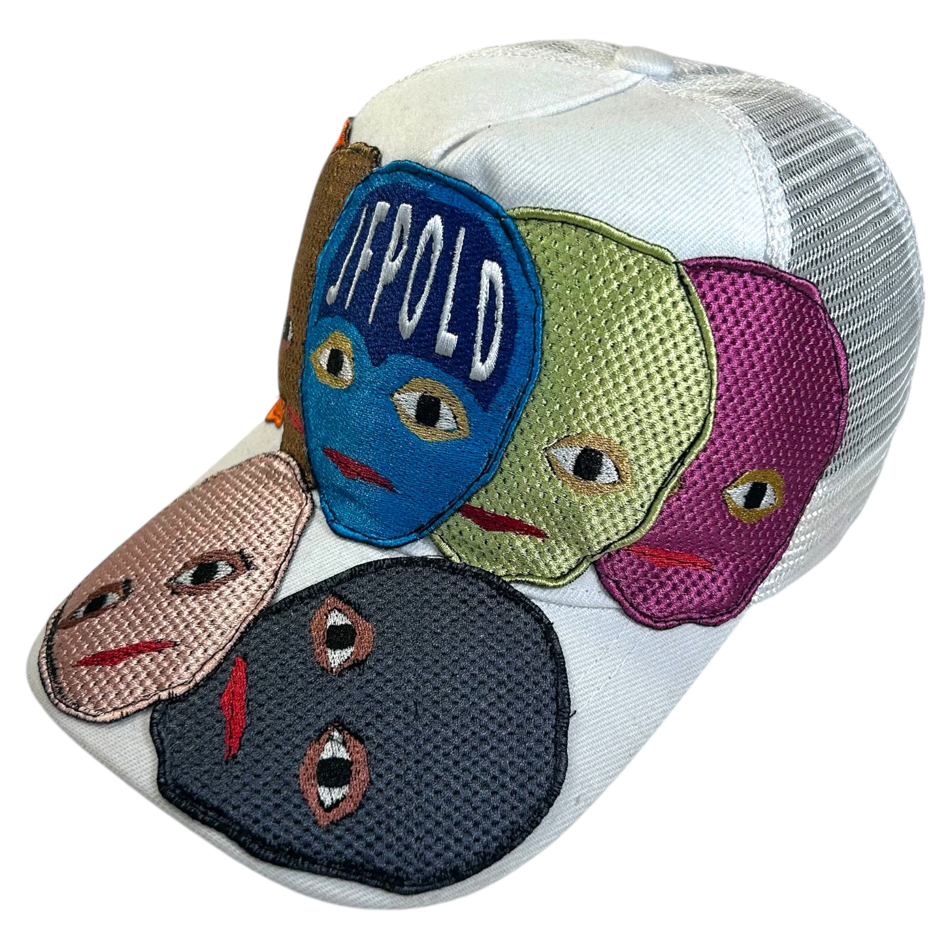 This is a vintage upcycled trucker hat that features a floral pattern of faces across the front and the brim. This hat is like an art piece on your head and it also can match with most outfits.